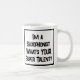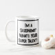 Funny slogan on a Coffee mug that says "I'm a Saxophonist. What's YOUR super talent?". Coffee Mug for a Saxophonist. Black and white bold text.