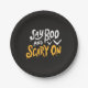 Funny Halloween Party Paper Plate with "Say Boo and Scary On" quote.