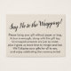 If you're hosting a no-gift-wrap display baby shower for the new mommy-to-be, this simple card could be the choice for you. Using a pretty, modern script font, I first added a header that announces the intention in a mildly cheeky way: "Say No to the Wrapping!" on the front, and "to" and "from" for the gift tag side. The template field was set up to offer instructions for guests not wrapping their present; please feel free to change the wording in any way you wish. All fonts and colors can be modified as you see fit.