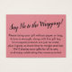 If you're hosting a no-gift-wrap display baby shower for the new mummy-to-be, this simple card could be the choice for you. Using a pretty, modern script font, I first added a header that announces the intention in a mildly cheeky way: "Say No to the Wrapping!" on the front, and "to" and "from" for the gift tag side. The template field was set up to offer instructions for guests not wrapping their present; please feel free to change the wording in any way you wish. All fonts and colours can be modified as you see fit.