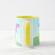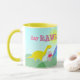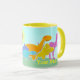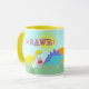 Say Rwar! Dinosaurs Name Mug. A cute dinosaur family with yellow Diplodocus, pink baby dinosaur egg, blue Stegosaurus, orange Diplodocus, a sweet yellow Triceratops and purple T-Rex cartoon dinos in a sunny landscape with the sun shining in a blue sky personal drinking mug with Your Name. Add your name to personalise your unqiue dinosaurs mug and make it special! This dinosaur mug is fully customisable, add your images and texts. A very cool say "Rawr!" happy little dinosaur mug with your name on it!