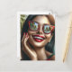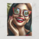 Keep in touch with this cute postcard. A beautiful happy woman smiling with red lipstick and sunglasses with a reflection of palm trees in them.
