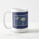 This mug features a reproduction in grunge texture style of the state flag of South Carolina, the Palmetto and Crescent, In faded-look blue on a darker blue background.