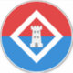 "Per fess gules and azure, a tower within a mascle argent."