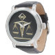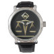Must-Have wristwatch w/ Art Deco inspired golden Scales of Justice set against a black background w/ custom text field for your monogram at 12:00. Together w/ this elegant vintage black leather band & black metal bezel, it's perfect for the lawyer, judge, law student, paralegal, etc. in your life!