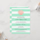 Baby shower invitation in coral and mint featuring white stripes and a scallop shell.