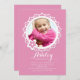 Pretty in pink and framed in white scallops. A round photo window invitation for your little girl's birthday. (FP)