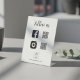 Modern white display sign with QR code and customizable logo area, ideal for businesses directing customers to their social media and website.