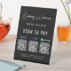 Chic custom black pedestal tabletop sign for your business with Venmo, Paypal and CashApp QR codes for customers to scan for payments and your name or brand showcased in a stylish white ignature script. Upload your QR codes and add your contact information in clean white lettering.