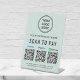 Simple light mint green table top pedestal sign for your business with Venmo, Paypal and CashApp QR codes for customers to scan for payments. Add your logo, QR codes, and business name, phone number and street address in simple typography.
