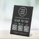 Simple modern black table top pedestal sign for your business with Venmo, CashApp and Zelle QR codes for customers to scan for payments. Add your logo, QR codes, and business name, phone number and street address in simple white typography.