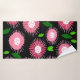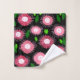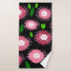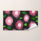 This towel set has a Scandinavian design of minimalist flowers in shades of pink and leaves in shades of green on a field of black.