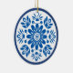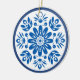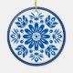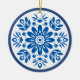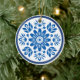 This blue and white ornament would make a great addition to your holiday decor. The Scandinavian Folk Art inspired design features flowers to shape a snowflake. This double sided ornament is one of a set of three.