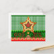 A folksy and decorative GOD JUL postcard in Scandinavian Christmas style. Illustrated by Anni Arts in the style of traditional Scandi folk paintings. Folk star, braid, gingham and cute reindeer horn buton in traditional colours.