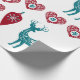 Modern, artsy Christmas wrapping paper with a Scandinavian / Nordic pattern that includes red hearts (with leaves and flowers), red baubles (with a snowflake design), and turquoise reindeer.