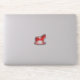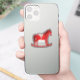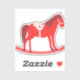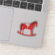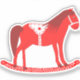 This awesome shaped Christmas sticker features a digital art image of a cute Scandinavian style rocking horse. The horse is red with a dark red mane, tail and hooves. The friendly horse is smiling. It has a white saddle and reins with pretty red Scandi folk style patterns on the saddle including the sun, moon and stars and hearts and flowers. The base of the rocking horse is red and is covered in pretty white leaves. The design was inspired by the Swedish Dala horse.