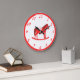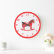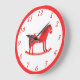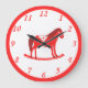 This awesome Christmas wall clock features a digital art image of a cute Scandinavian style rocking horse. The horse is red with a dark red mane, tail and hooves. The friendly horse is smiling. It has a white saddle and reins with pretty red Scandi folk style patterns on the saddle including the sun, moon and stars and hearts and flowers. The base of the rocking horse is red and is covered in pretty white leaves. The design was inspired by the Swedish Dala horse.