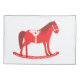 This awesome double sided patterned Christmas pillowcase features a digital art image of a cute Scandinavian style rocking horse. The horse is red with a dark red mane, tail and hooves. The friendly horse is smiling. It has a white saddle and reins with pretty red Scandi folk style patterns on the saddle including the sun, moon and stars and hearts and flowers. The base of the rocking horse is red and is covered in pretty white leaves. The design was inspired by the Swedish Dala horse.