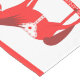 This awesome Christmas table runner features a digital art image of a cute Scandinavian style rocking horse. The horse is red with a dark red mane, tail and hooves. The friendly horse is smiling. It has a white saddle and reins with pretty red Scandi folk style patterns on the saddle including the sun, moon and stars and hearts and flowers. The base of the rocking horse is red and is covered in pretty white leaves. The design was inspired by the Swedish Dala horse.