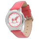 This awesome Christmas watch features a digital art image of a cute Scandinavian style rocking horse. The horse is red with a dark red mane, tail and hooves. The friendly horse is smiling. It has a white saddle and reins with pretty red Scandi folk style patterns on the saddle including the sun, moon and stars and hearts and flowers. The base of the rocking horse is red and is covered in pretty white leaves. The design was inspired by the Swedish Dala horse.