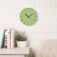 Light blue hand drawn simple leaves pattern on light green background Scandinavian style print with roman numeral clock face gives this clock versatility to go with modern, country, vintage or rustic decor themes