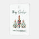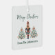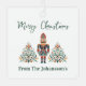 This custom holiday ornament features a Scandinavian Christmas theme on a plain white background. An image of a Nutcracker printed between two Scandinavian style Christmas trees is printed across the centre. A sample "Merry Christmas" greeting is printed above the nutcracker in an elegant script font. A sample family name is printed below the image which you can personalise to include your own custom name or text.