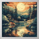 This poster captures the peaceful beauty of a mountain retreat in a retro, Scandinavian-inspired style. The design features a cosy lakeside cabin surrounded by majestic pine trees and rolling mountains under a vibrant, setting sun. Using a clean, mid-century modern aesthetic, the artwork's rich, earthy colours and simplified forms evoke a sense of quiet tranquillity and a deep connection to nature. It's the perfect piece for anyone who loves the outdoors, vintage design, and the serene feeling of a peaceful escape.