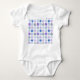 This baby bodysuit has a winter design of different snowflakes in blues and purples in rows.