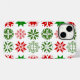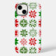 This phone case has a Christmas design of different snowflakes in red and green in rows.