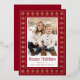 A Happy Holidays or Merry Christmas photo greeting card with a Scandinavian style pattern border in real foil, custom name, single photo template and customizable text "Happy Holidays". Dark red background.