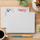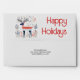 Scandinavian folk art style deer Christmas holiday envelope. It features a deer and stems in red and blue and the text "Happy Holidays" on the flap. The inside includes a pattern of the diagonal text "Happy Holidays"
