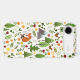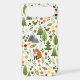 Scandinavian folk art style nature illustrations (fox, leaves, trees, flowers, mountains and birds) in a surface pattern design on a light cream color background.