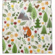 Scandinavian folk art style nature illustrations (woodland; fox, leaves, trees, flowers, mountains and birds) in a surface pattern design on a light cream color background.