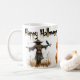 The scarecrow, with its patchwork clothes and straw hat, is centrally placed, surrounded by golden corn stalks. The two stacked pumpkins to the right of the scarecrow are bright and eye-catching. The phrase "Happy Halloween" is boldly written in black, arching over the scene. The simplicity of the white background makes the colorful elements and the festive message pop, ensuring a striking and cheerful Halloween mug.
