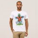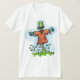 Don’t be scared it is just a scarecrow. They are designed to scare the birds away. This scarecrow has an orange top on and appears to be wearing a bucket on its head. It’s arms are outstretched and is is standing in some green grass. This scarecrow design looks great on this mens t-shirt. Perfect for yourself or as a gift