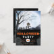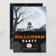 The lower half of the invitation is shrouded in darkness, with a black background providing the canvas for faded grey decorations. Skulls, bats, and tombstones emerge like ghosts from the night, adding a touch of macabre elegance to the design. This harmonious blend of sophistication and the supernatural captures the essence of Halloween perfectly.