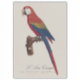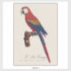 The image presents a finely detailed illustration of the Scarlet Macaw (Ara macao), also known as the Red-Breasted Macaw, perched elegantly on a textured branch. This artwork is characteristic of the refined natural history style pioneered by Jacques Barraband, whose meticulous attention to colour and anatomy brought exotic birds to life in early scientific publications. The macaw’s vivid red plumage dominates the composition, complemented by striking bands of golden yellow and deep blue along its wings and elongated tail. Its robust, curved beak and pale facial skin, delicately lined with feather patterns, are rendered with precision, emphasizing both beauty and biological accuracy.