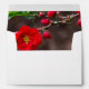A beautiful flower lined envelope that matched the wedding invitation Scarlet Top Wedding. This features some red blooms from a Double Take Flowering Quince bush towards the top of the image. They look a lot like a camellia. During the spring they bloom these beautiful double flowers.