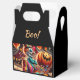Personalised Halloween favour boxes. Do you find clowns and carnivals creepy? Then here is some scary Halloween supplies for you. Vintage spooky clown at the retro carnival holding a jack o' lantern and a bowl of candy surrounded by Halloween balloons.