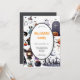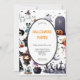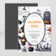 The design features everything spooky from a black cat with flying bats to a spider's cobweb, ghosts, a witches broomstick, skull & bone, magic glass ball and a jack-o-lantern pumpkin all in black, white, grey and orange colours. The template wording is easy to personalise and your party guests will be in for a scare when they receive these invites in the mail!