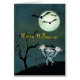 Fun Halloween illustration of a Mummy in a scary night scene with a full moon, dead tree, and bats. A very detailed Happy Halloween text in yellow colour and creepy font.