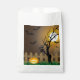A Halloween illustration with a scary tree with a cat, spooky bats flying, a bright full moon and a creepy pumpkin.