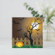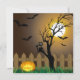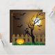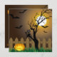 A Halloween illustration with a scary tree with a cat, spooky bats flying, a bright full moon and a creepy pumpkin.