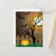 A Halloween illustration with a scary tree with a cat, spooky bats flying, a bright full moon and a creepy pumpkin.