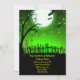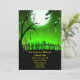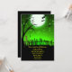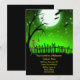 A scary walking skeleton in a grave yard with a full moon and green sky background. Very fun and scary design for your Halloween Party invitations.