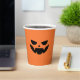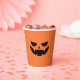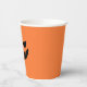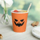 Spooky chic paper cups for your Halloween party feature a scary jack o lantern face on an orange pumpkin background.