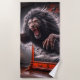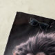 This beach towel has a scary lion on it.