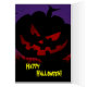 Very scary looking pumpkin with an owl in a tree above. A moody deep blue night time sky background. Very fun and scary design for your Halloween greeting card.
