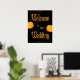Halloween wedding reception sign print (vertical) with Welcome to our Wedding text and two orange scary pumpkins on black background. Dimensions of the sign print (poster) are 18 inches by 24 inches.