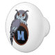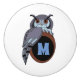 An illustration of a scary scop owl drawn from the side view. The bird is looking over its shoulder. Beneath the owls wing is an enlarged eye that is meant to be the frame of a monogram. The M is short for monogram and can be personalised for your initials.